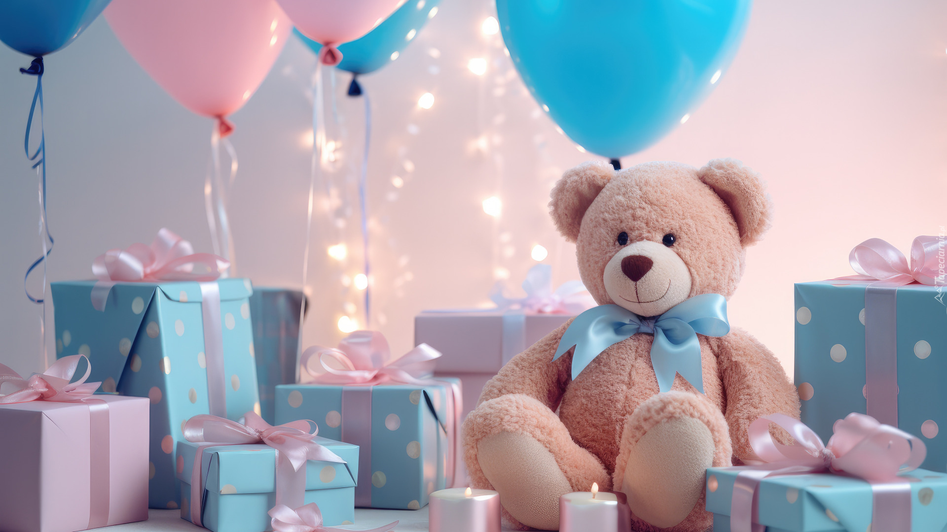 Edytor tapety: Siedzący miś obok balonów i prezentów urodzinowych
