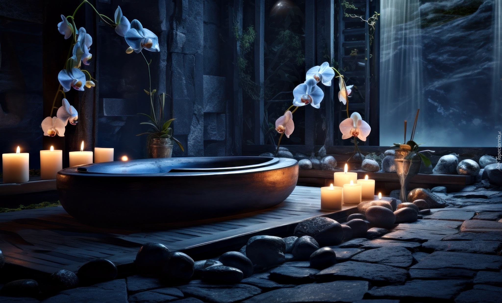 Edytor tapety: Zapalone świece i storczyki w SPA