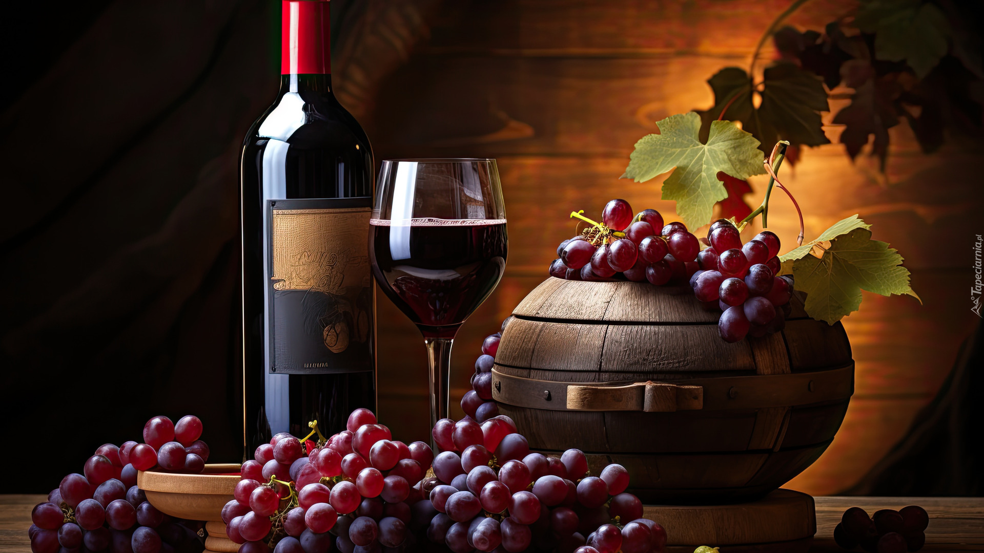 Edytor tapety: Butelka i kieliszek z winem obok winogron