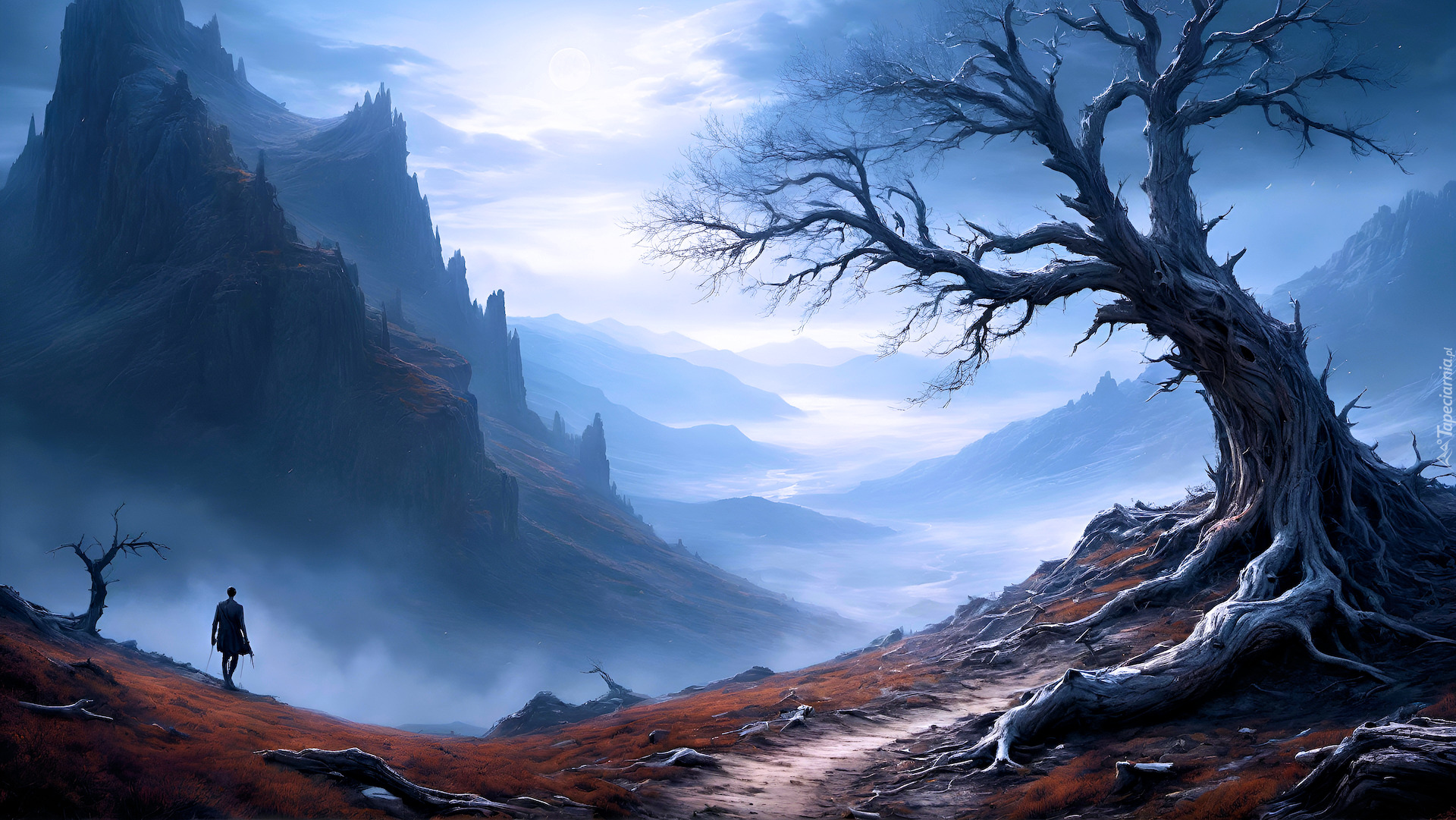 Edytor tapety: Wędrowiec spoglądający na zamglone góry