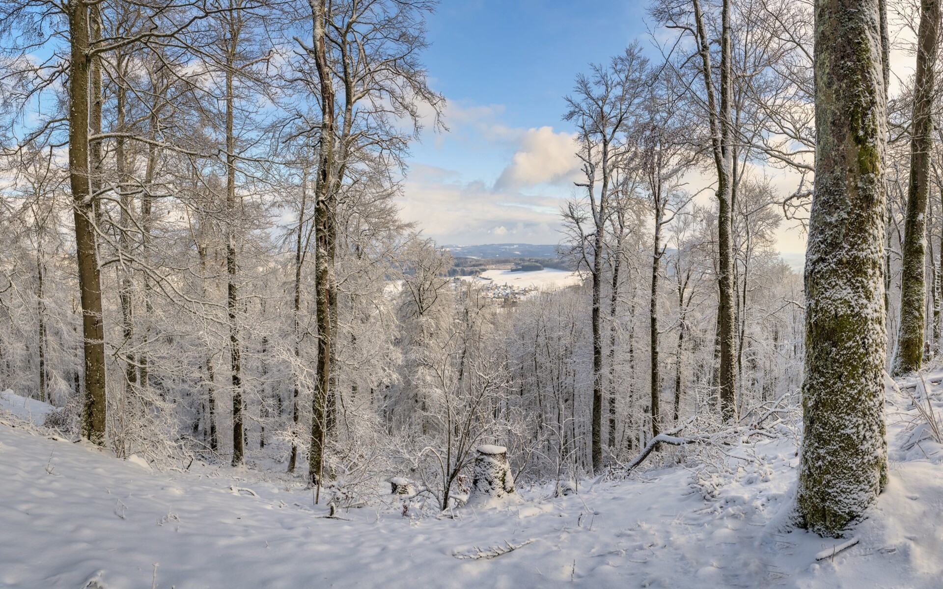 Edytor tapety: Rozświetlony las na ośnieżonym wzgórzu