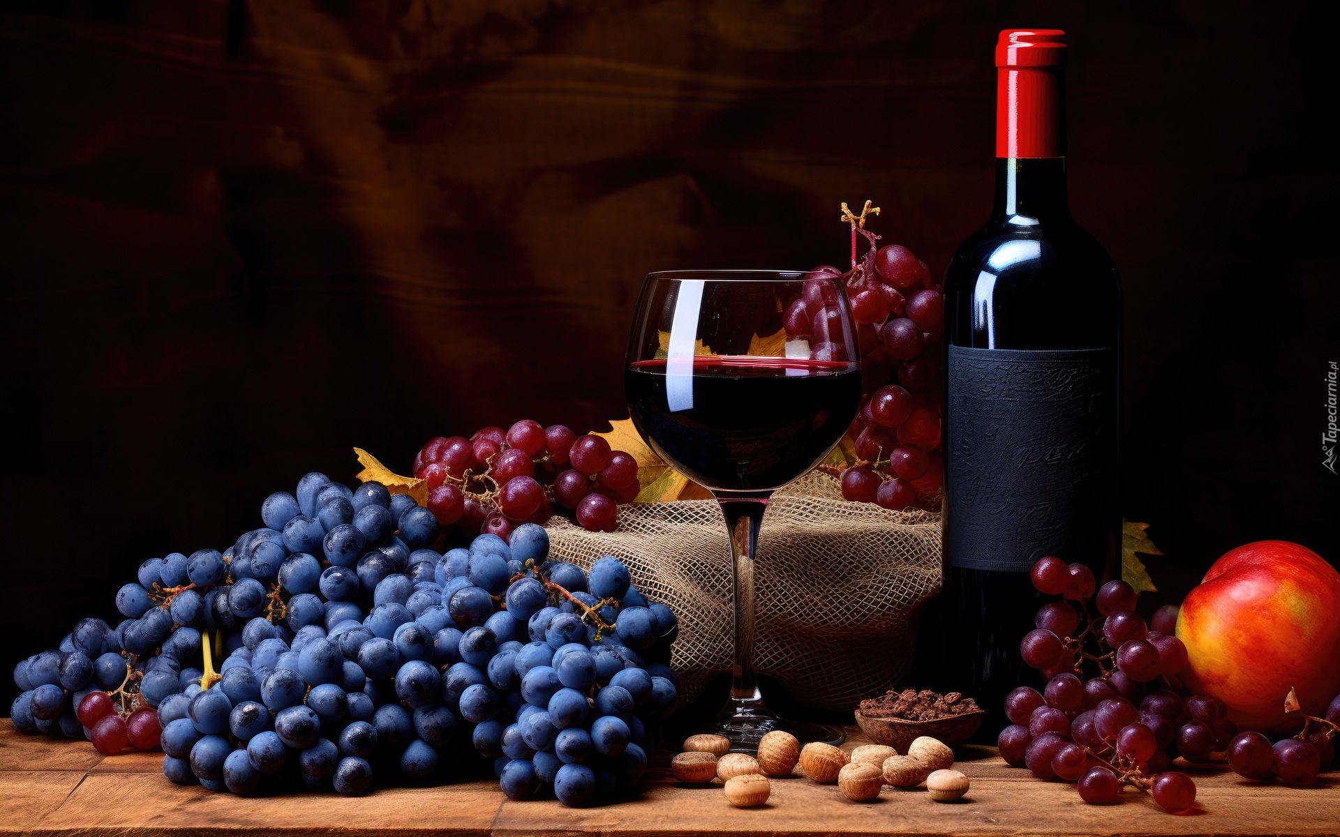 Edytor tapety: Winogrona obok kieliszka z winem i butelki