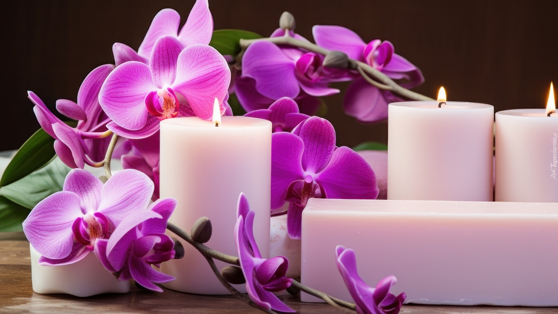 Edytor tapety: Białe świece i fioletowe storczyki