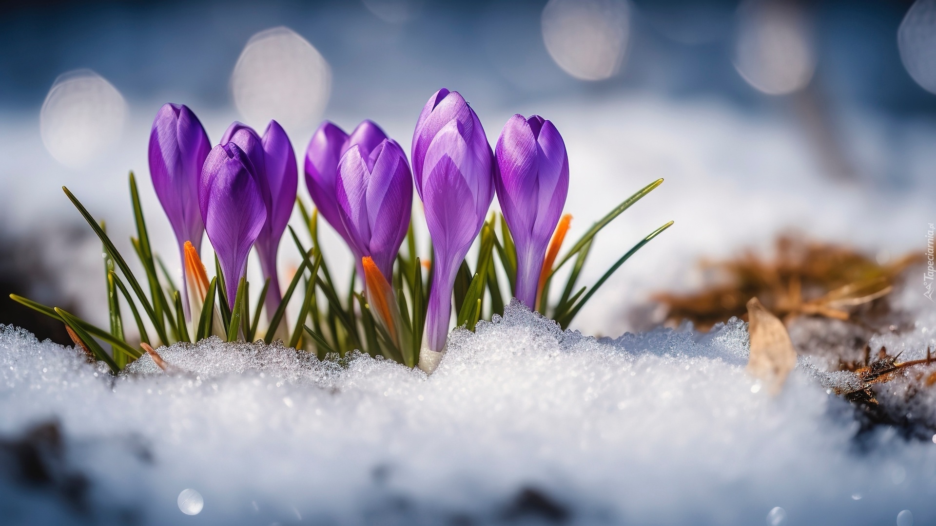 Edytor tapety: Rozkwitające pąki krokusów w śniegu