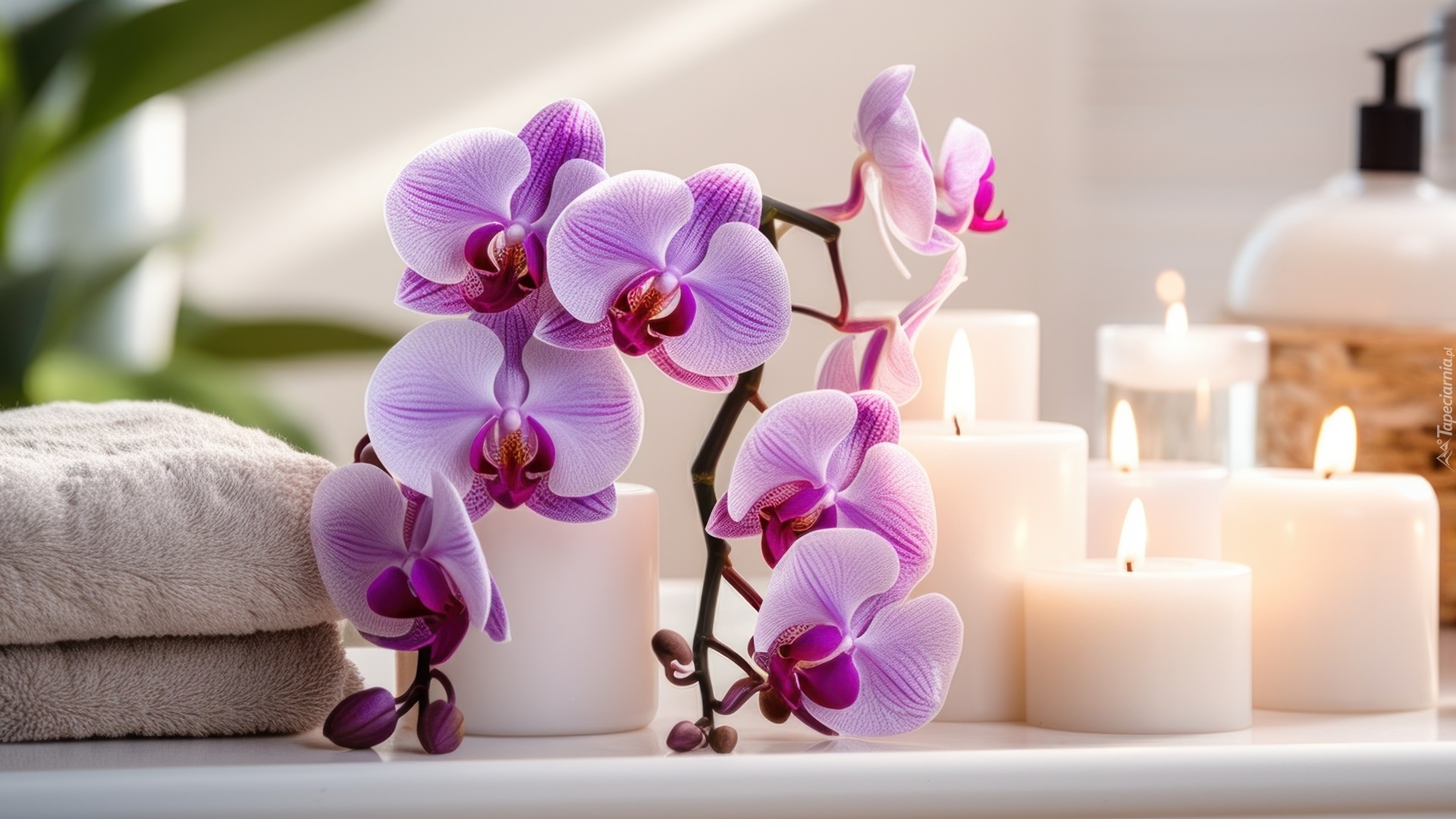 Edytor tapety: Storczyk obok ręczników i zapalonych świec