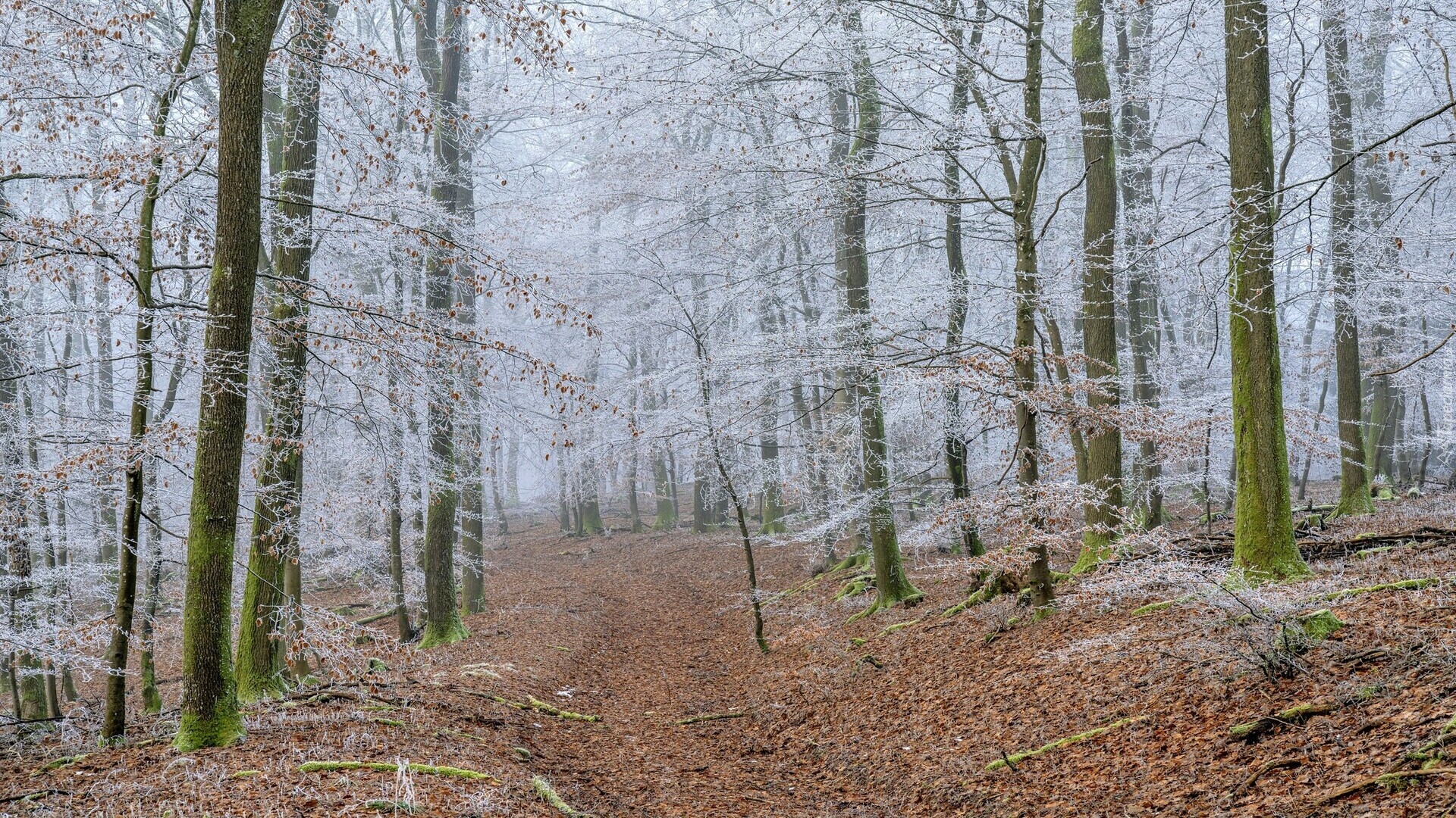 Edytor tapety: Opadłe liście pod oszronionymi drzewami przy leśnej drodze