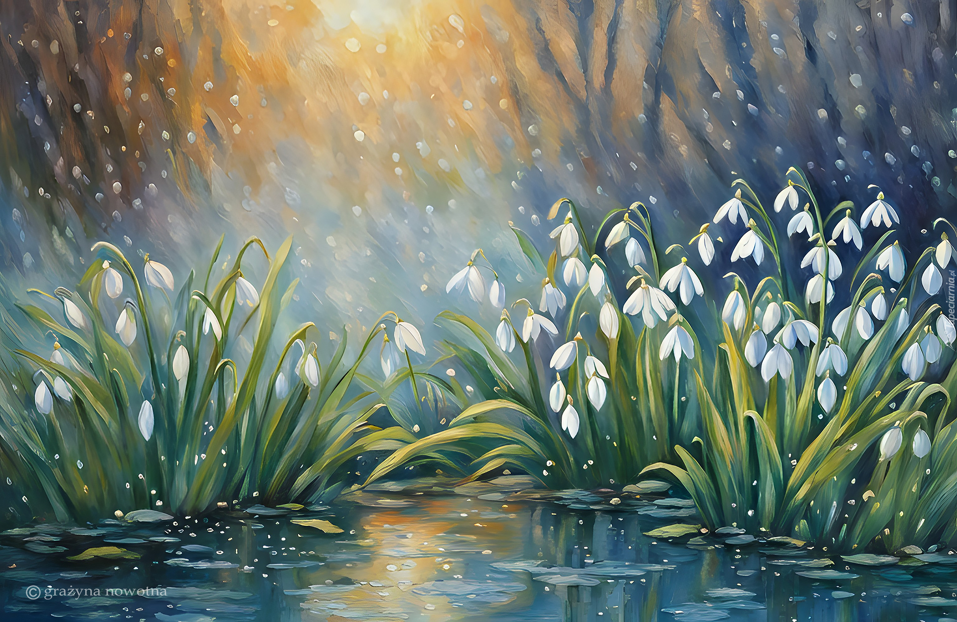 Edytor tapety: Białe przebiśniegi nad wodą