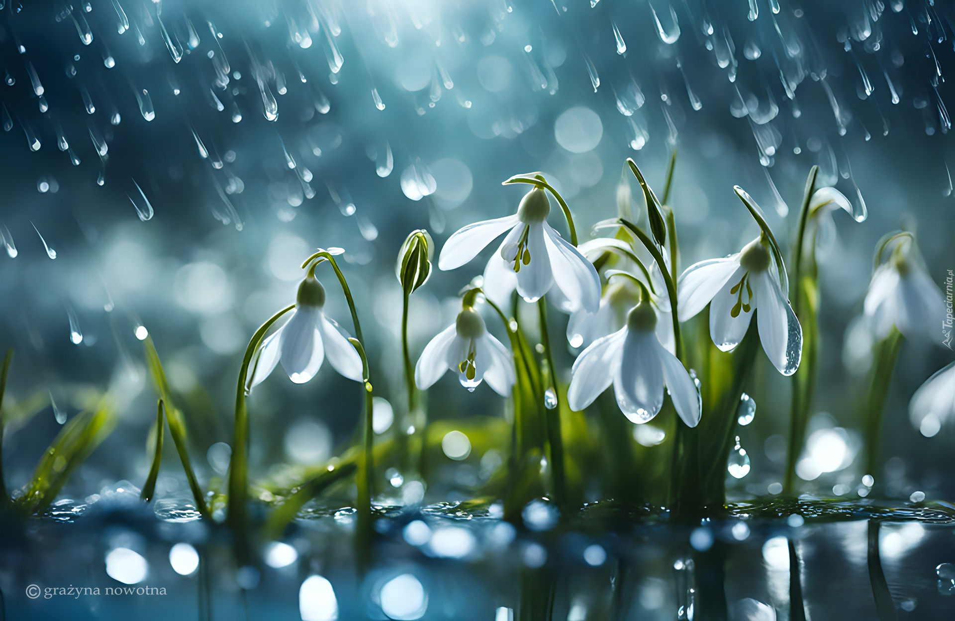 Edytor tapety: Białe przebiśniegi w deszczu