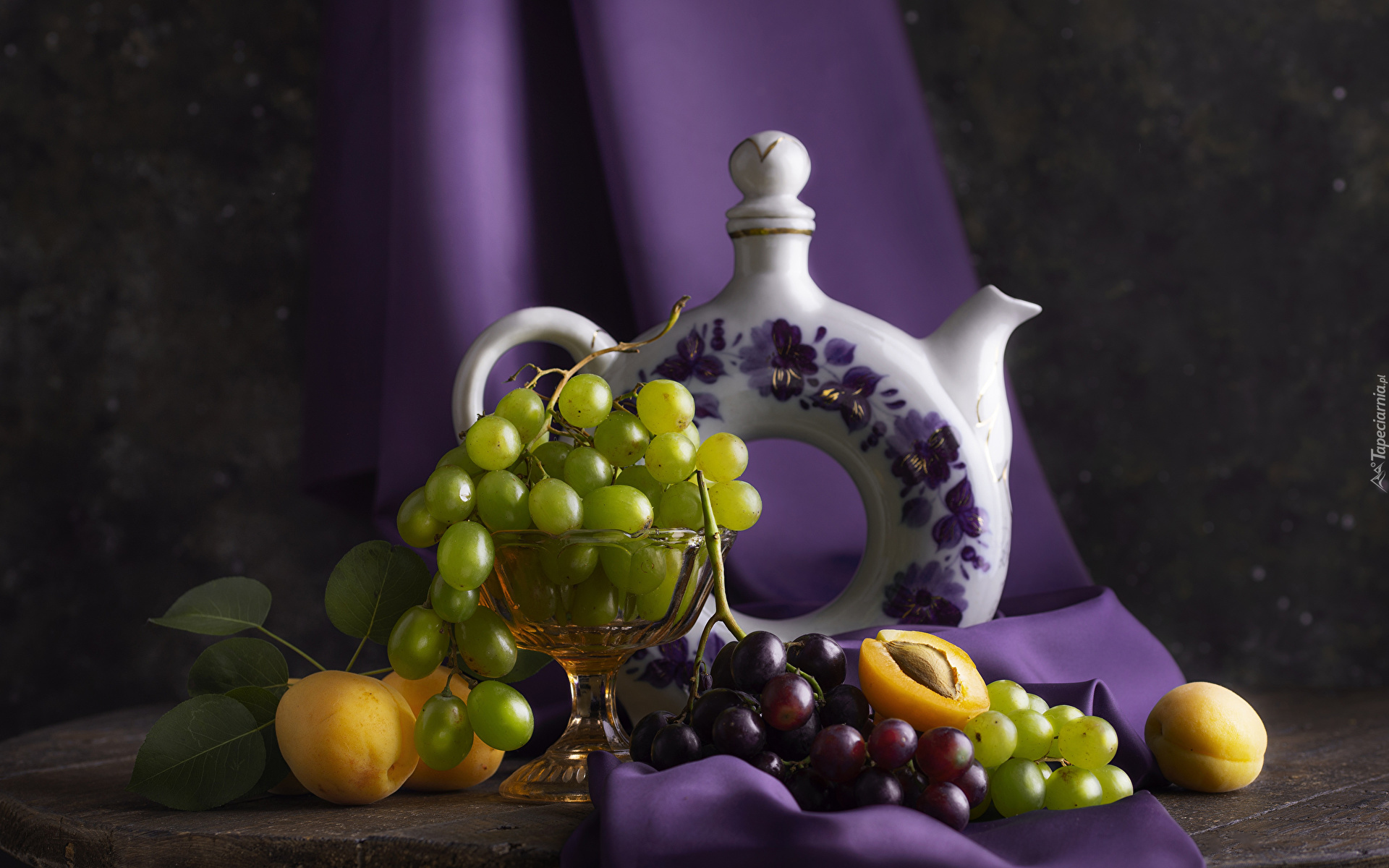 Edytor tapety: Imbryk i owoce na fioletowym materiale