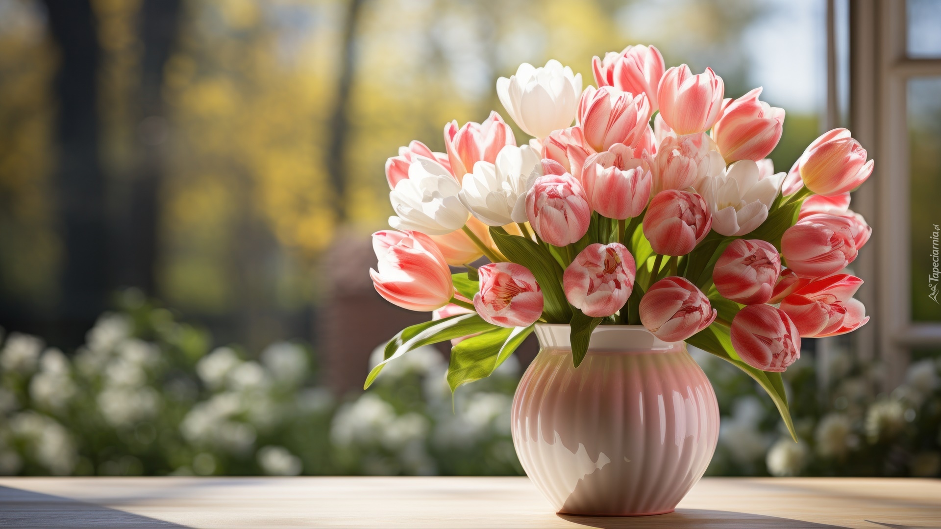 Edytor tapety: Rozświetlone różowe i białe tulipany w wazonie