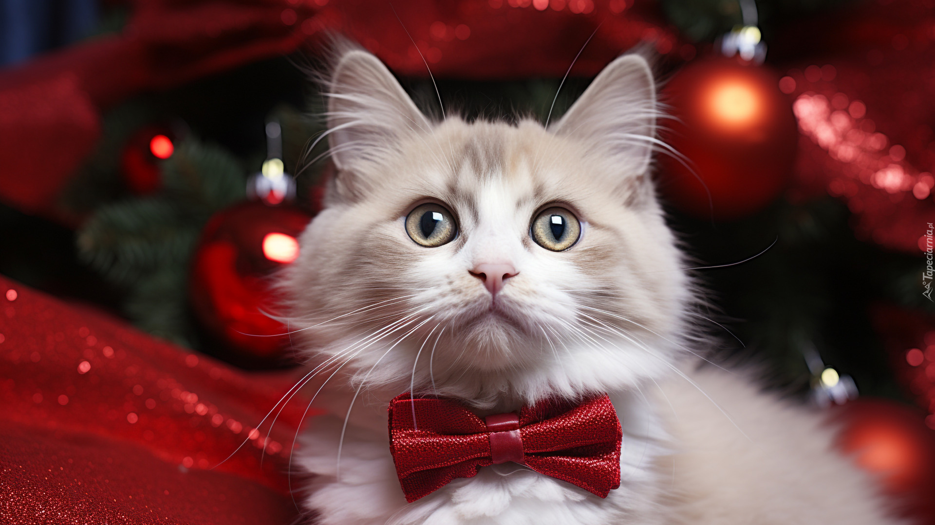 Edytor tapety: Biały puszysty kotek z czerwoną muszką na szyi