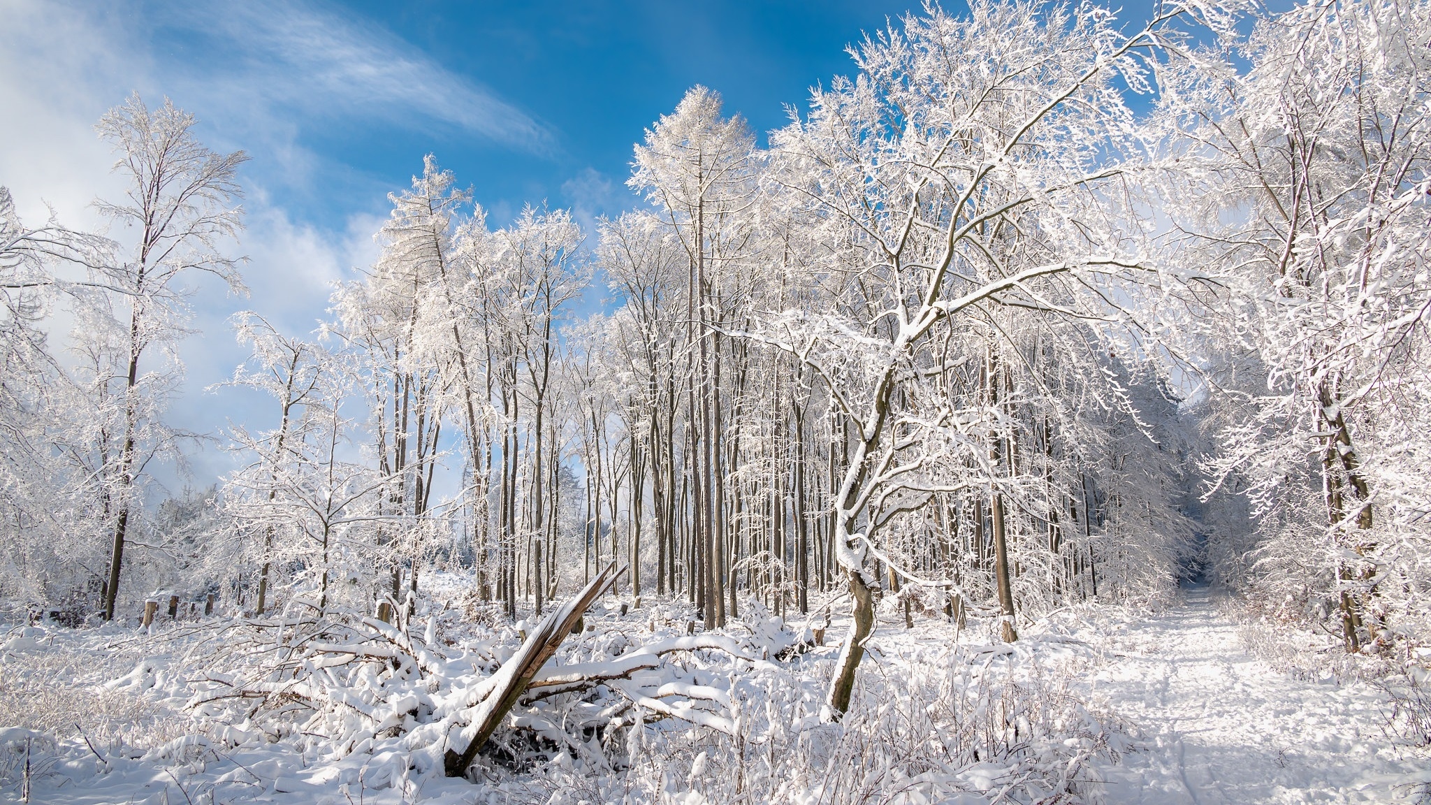 Edytor tapety: Ośnieżone drzewa i droga w słonecznym lesie