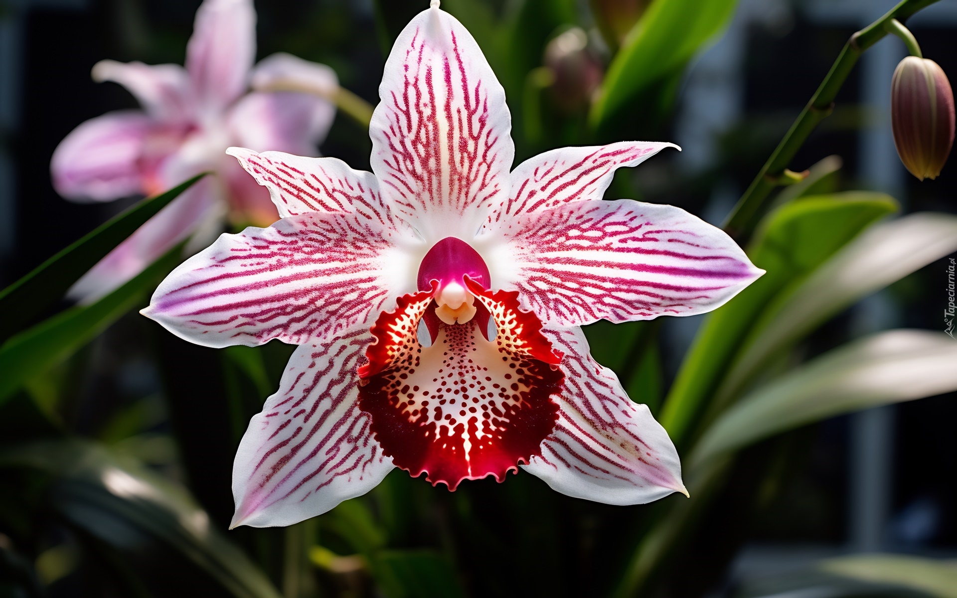 Edytor tapety: Nakrapiany kwiat biało-czerwonego storczyka w zbliżeniu