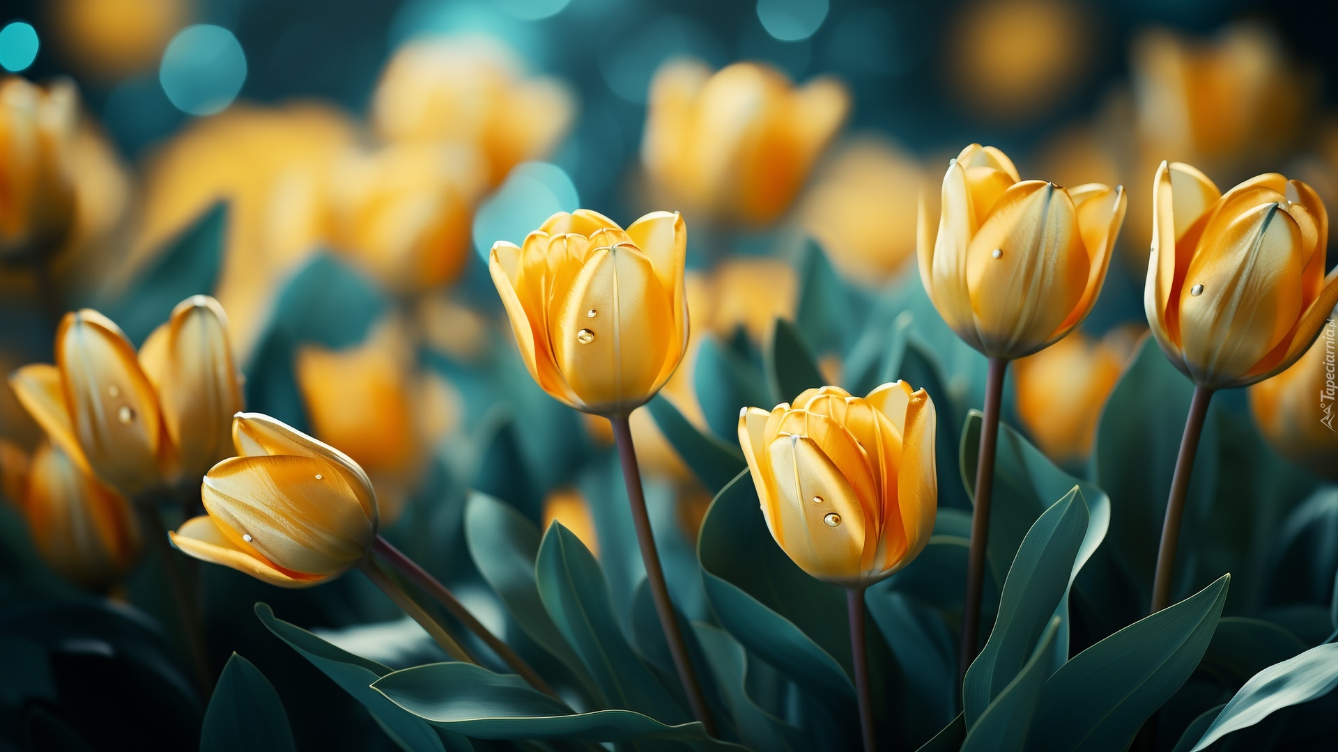 Edytor tapety: Krople na żółtych tulipanach w 2D