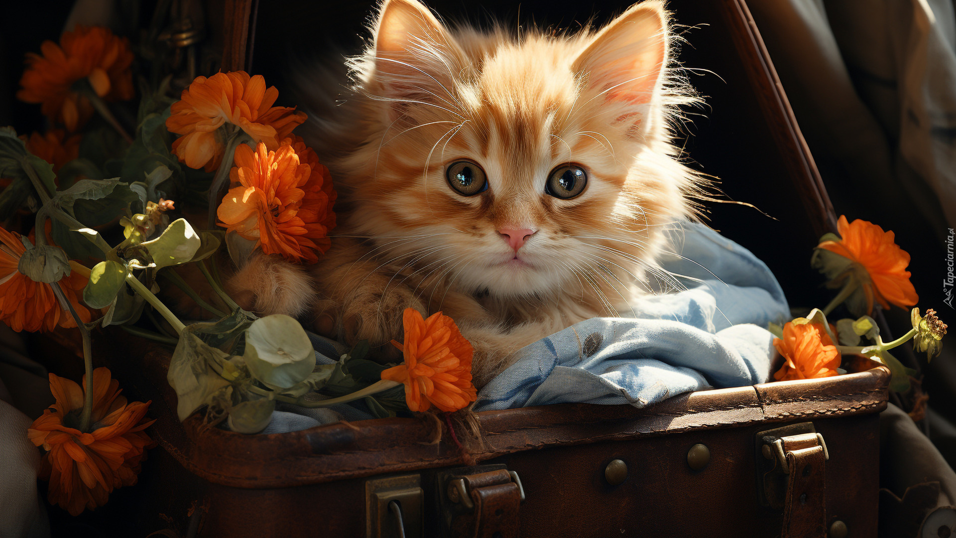Edytor tapety: Mały rudy kotek obok kwiatów