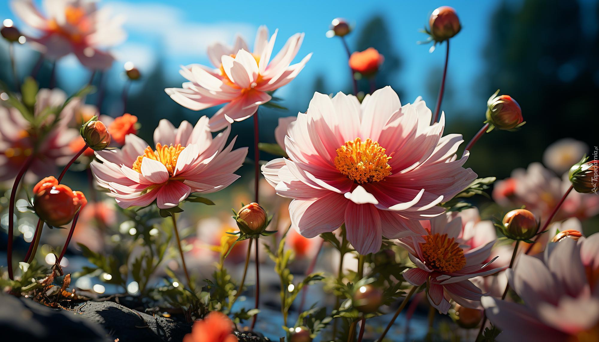 Edytor tapety: Rozświetlone różowe kwiaty i pąki na tle nieba
