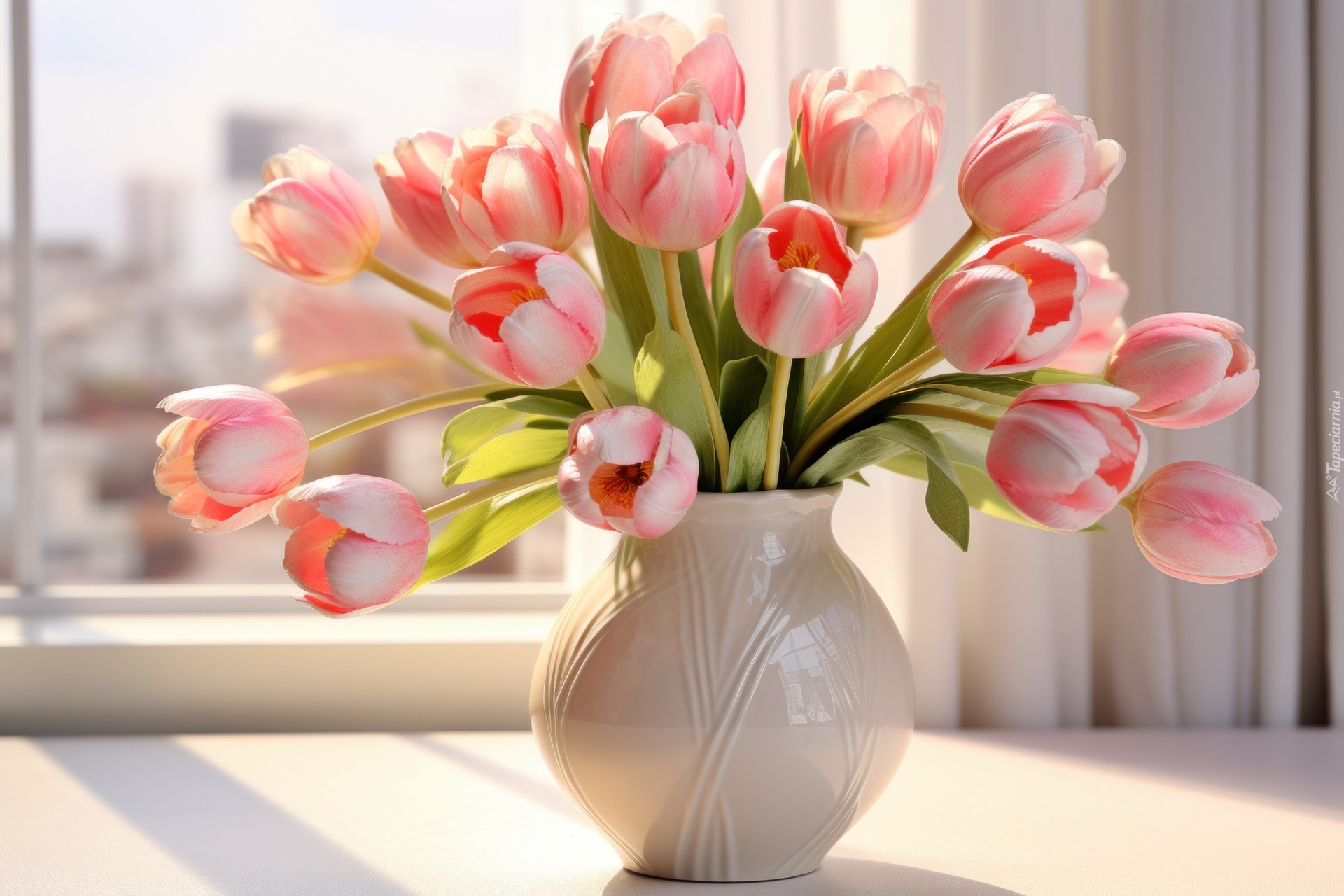 Edytor tapety: Bukiet różowych tulipanów w białym wazonie