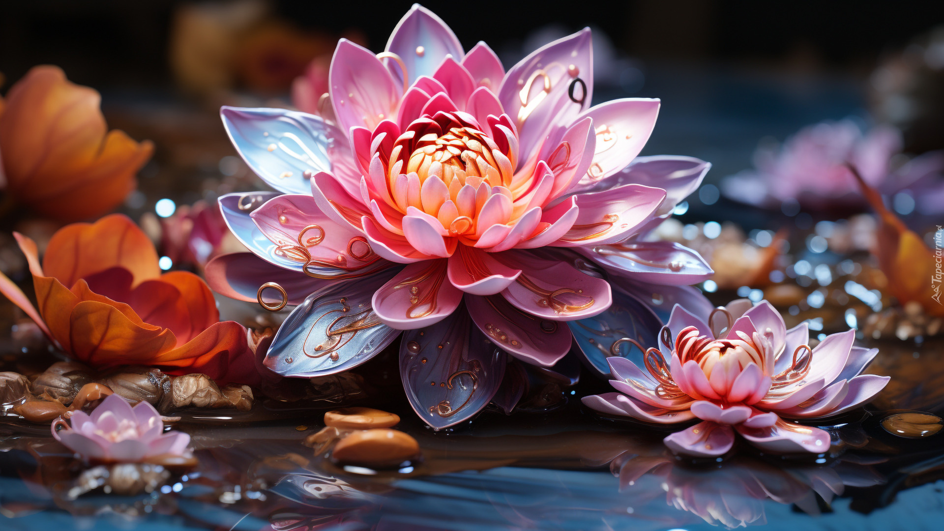 Edytor tapety: Rozkwitnięte kolorowe kwiaty na wodzie w zbliżeniu