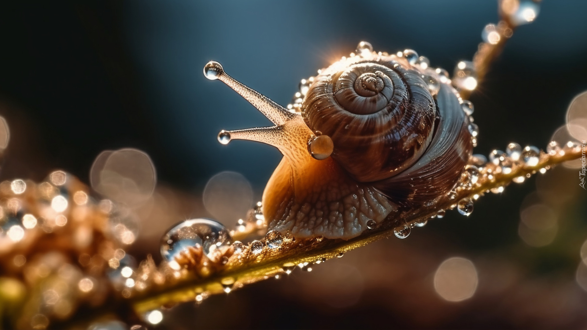 Edytor tapety: Ślimak na łodydze z kropelkami wody