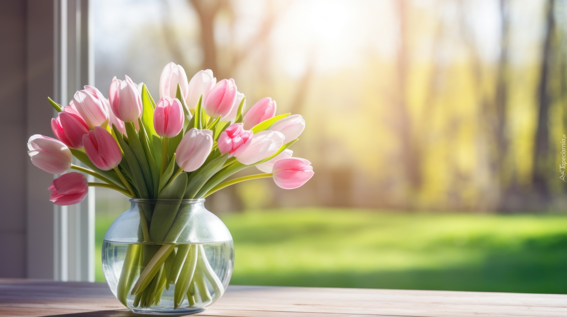 Edytor tapety: Różowe tulipany w szklanym wazonie przy oknie