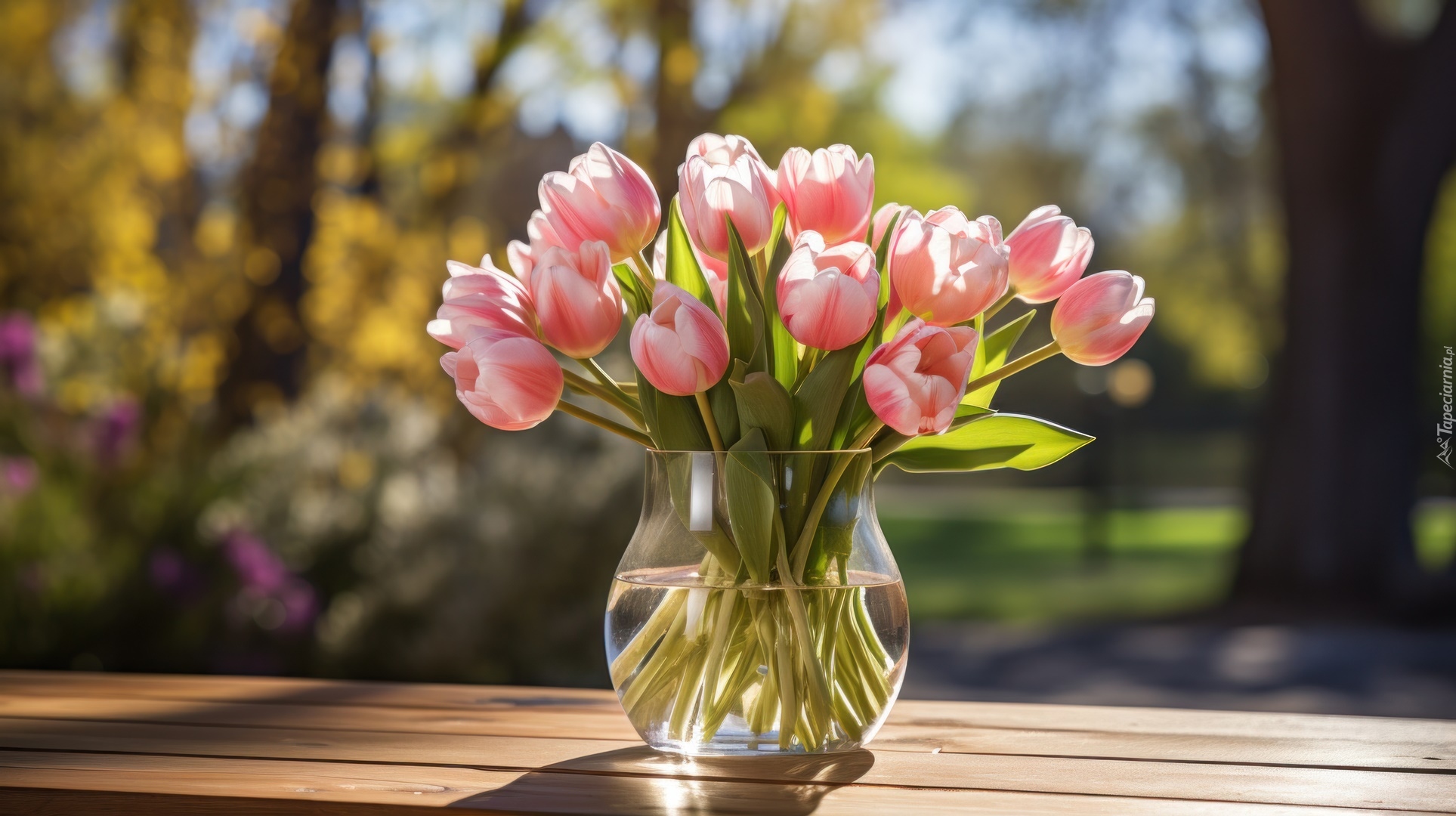 Edytor tapety: Różowe i rozświetlone tulipany w szklanym wazonie