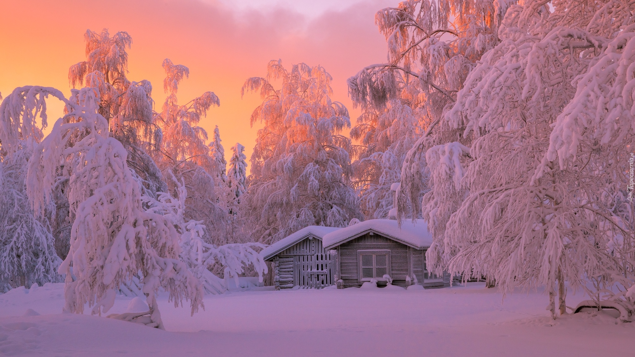 Edytor tapety: Kolorowe niebo nad ośnieżonymi drzewami i domami