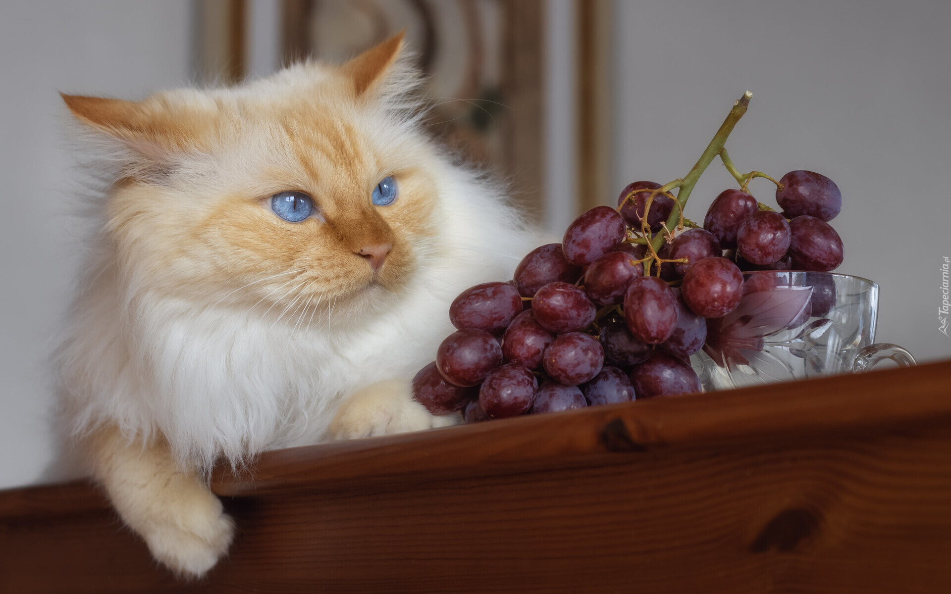 Edytor tapety: Kot na stole obok winogron