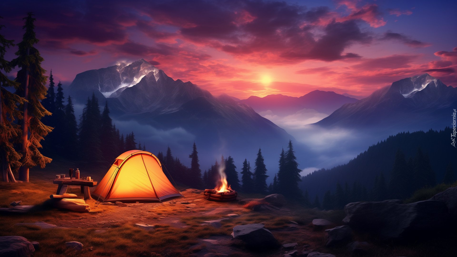 Edytor tapety: Ognisko obok namiotu na tle gór