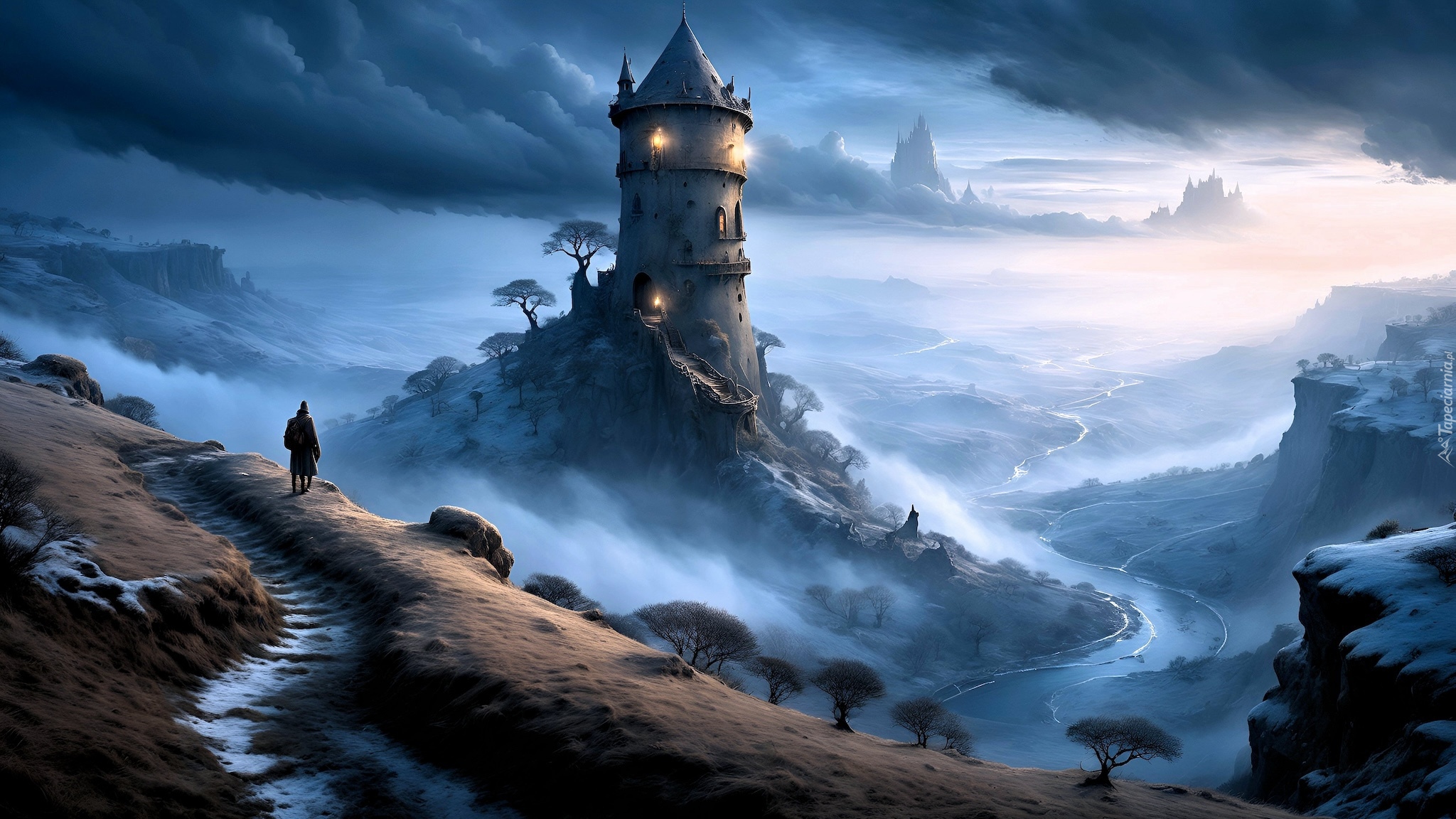 Edytor tapety: Wieża na zamglonym wzgórzu