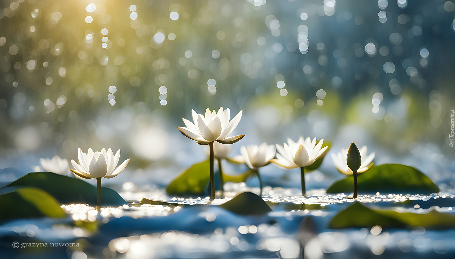 Edytor tapety: Rozświetlone białe lilie wodne w wodzie