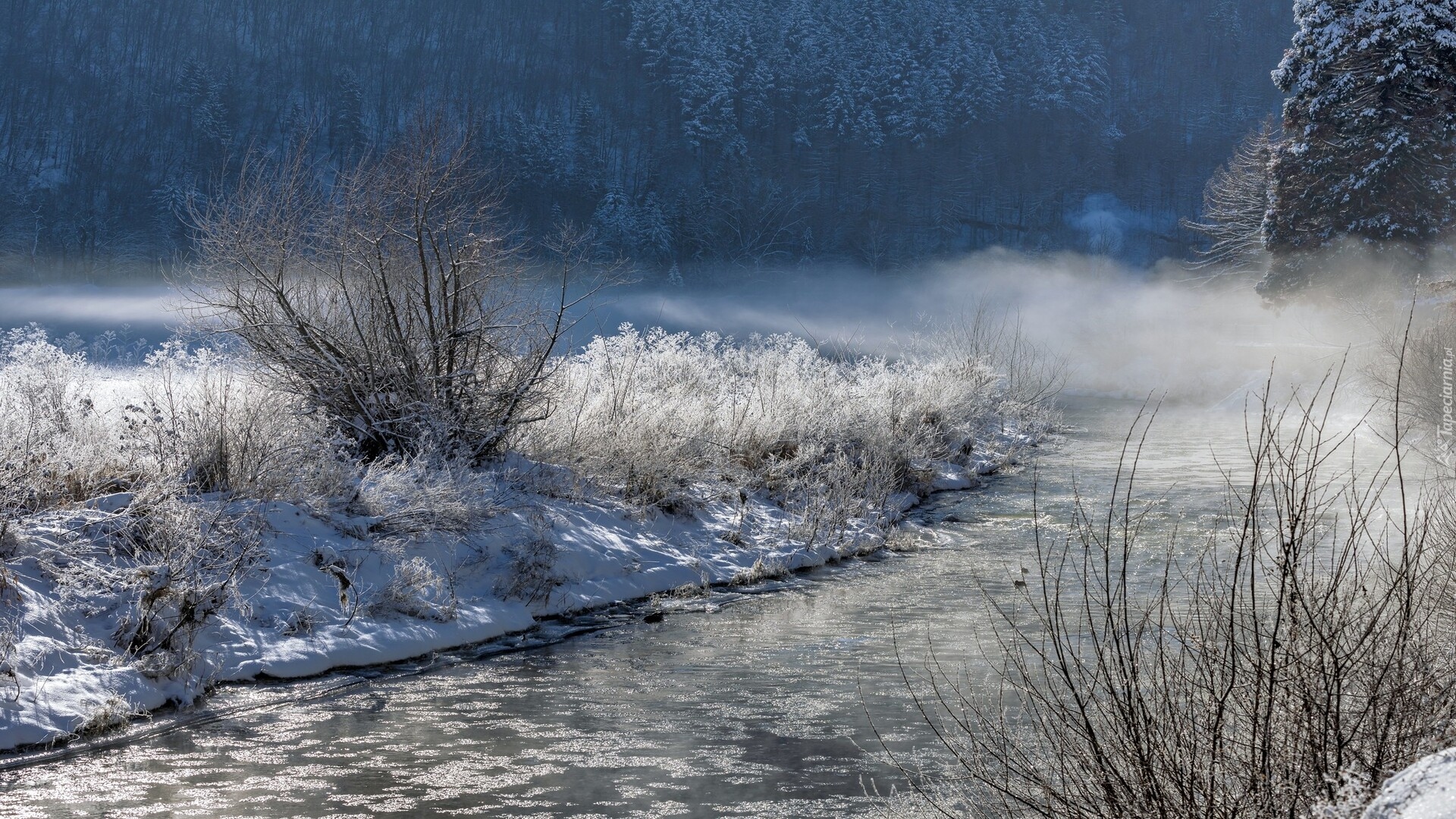 Edytor tapety: Oszronione krzewy i trawa nad rzeką