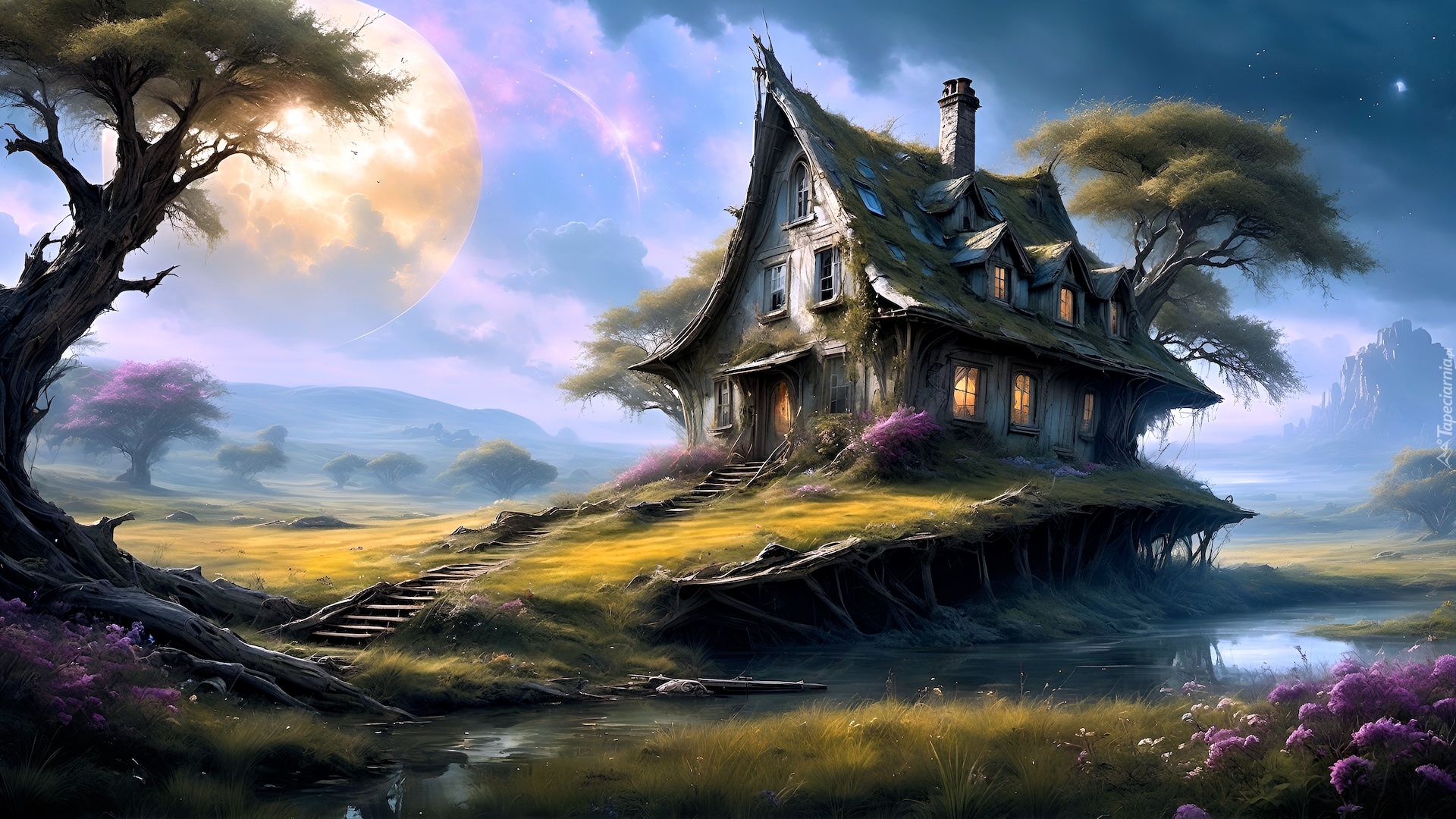 Edytor tapety: Schody do starego domu na wzniesieniu nad rzeką