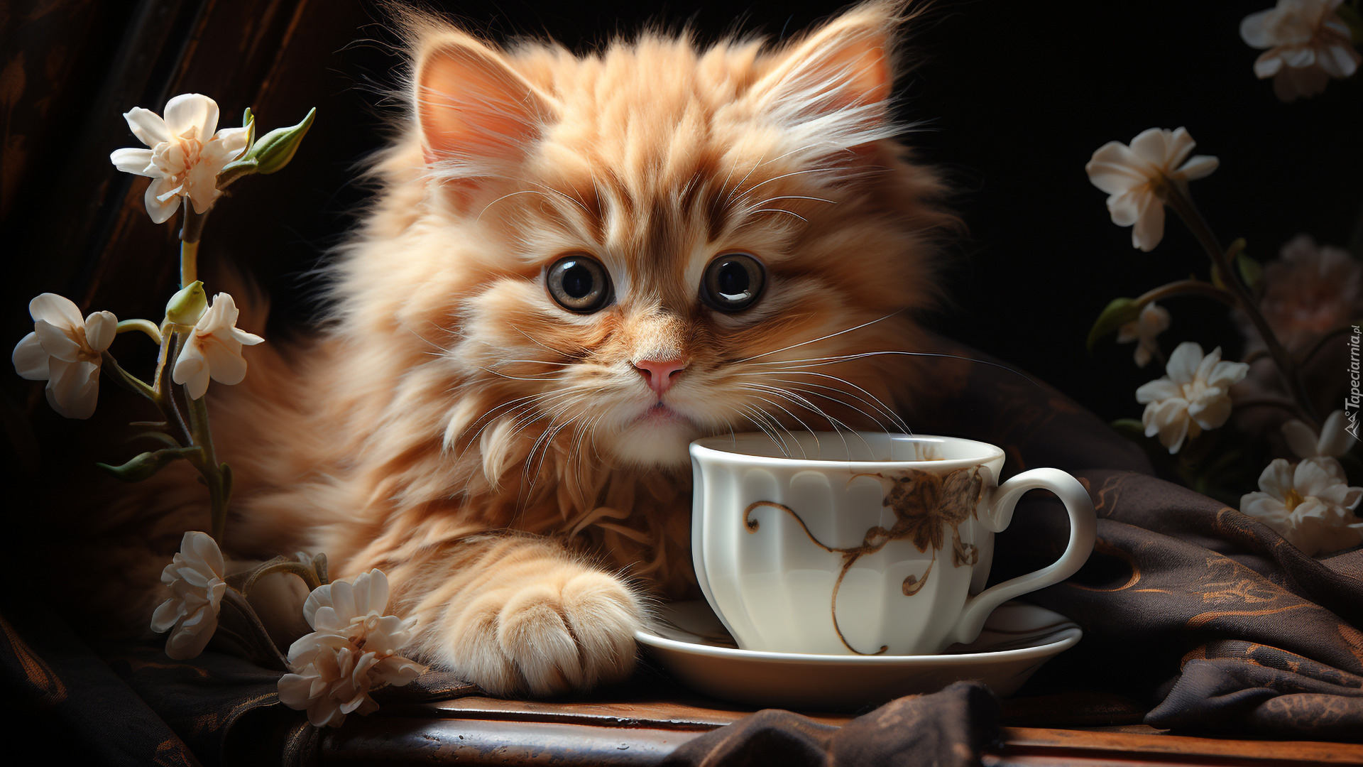 Edytor tapety: Rudy mały kotek obok filiżanki i kwiatów