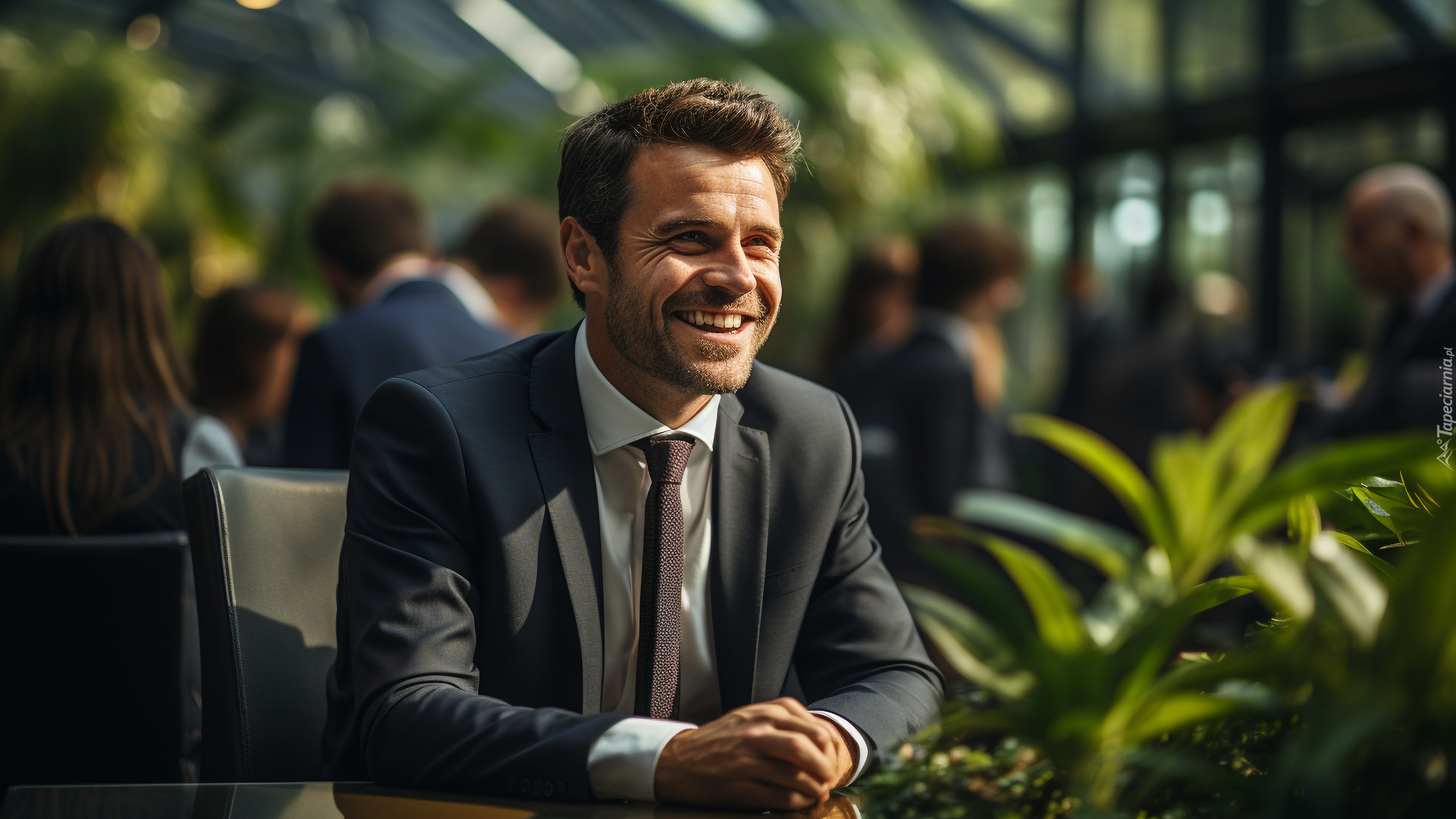 Edytor tapety: Uśmiechnięty mężczyzna w garniturze przy stoliku