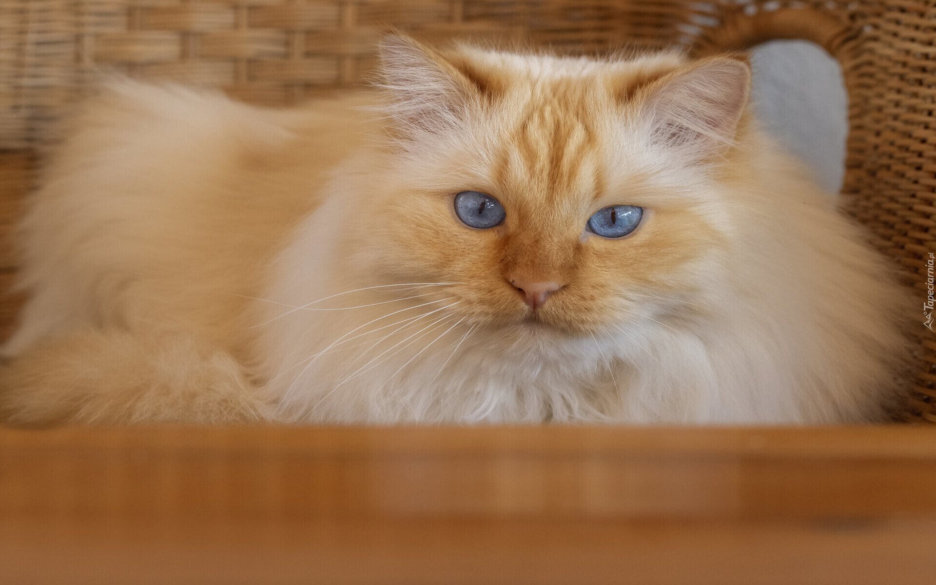 Edytor tapety: Puszysty rudowłosy kot z niebieskimi oczami