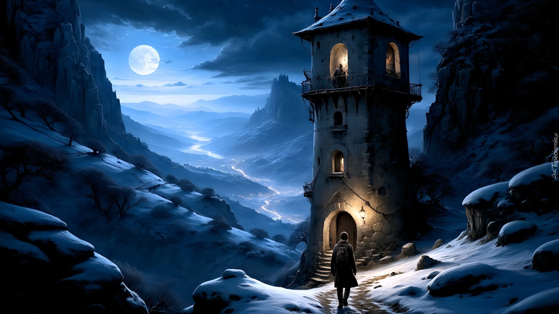 Edytor tapety: Wieża w górach i człowiek w blasku księżyca