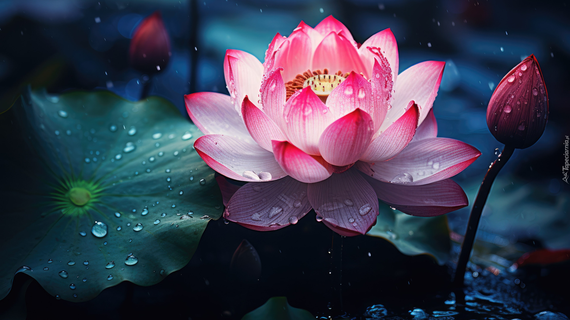 Edytor tapety: Pąk i rozwinięty kwiat lotosu w wodzie