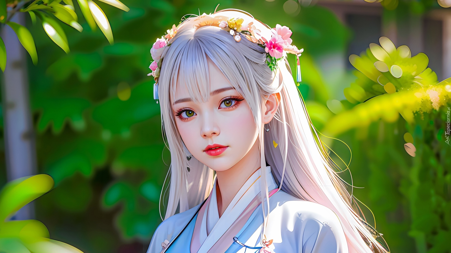 Edytor tapety: Długowłosa dziewczyna z kwiatami we włosach