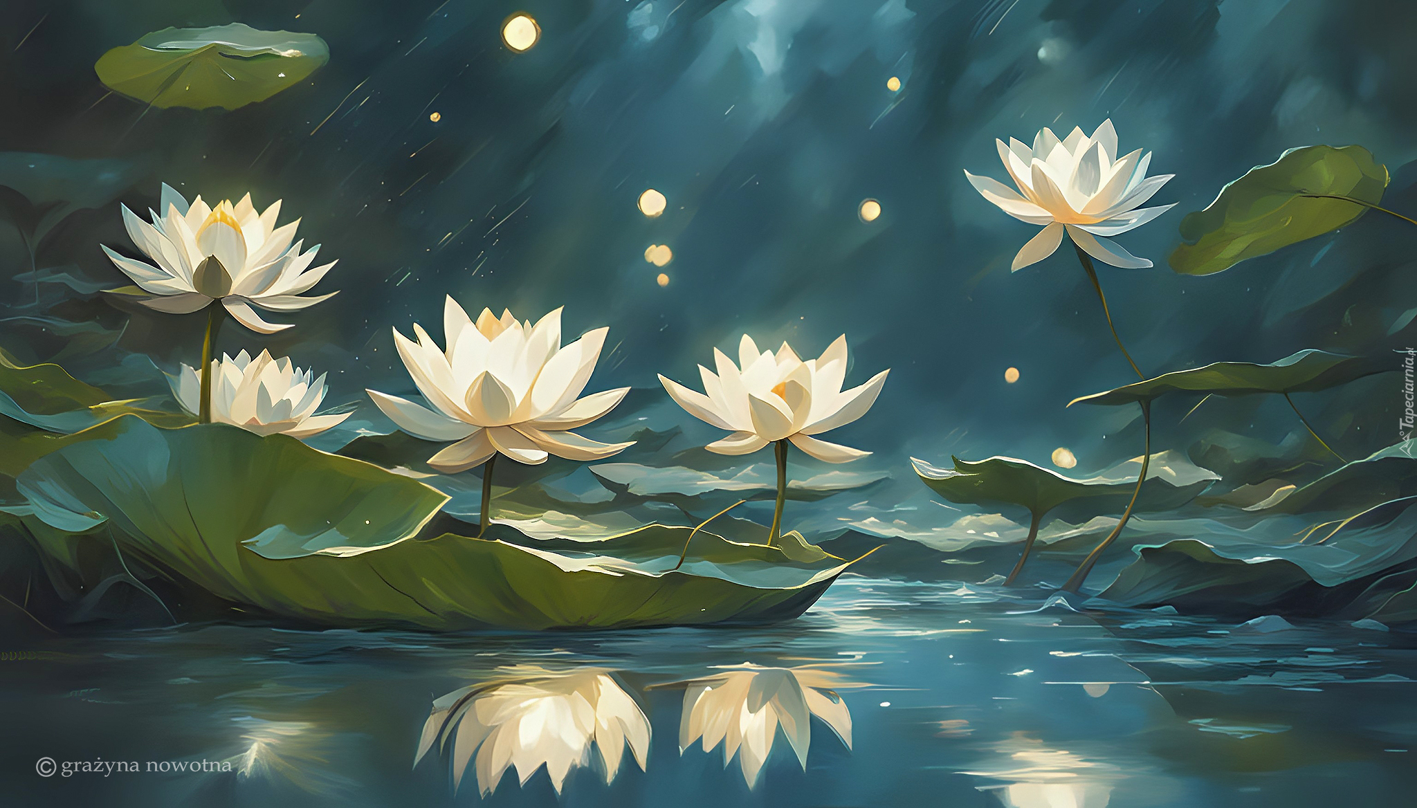 Edytor tapety: Białe lilie wodne i liście w grafice