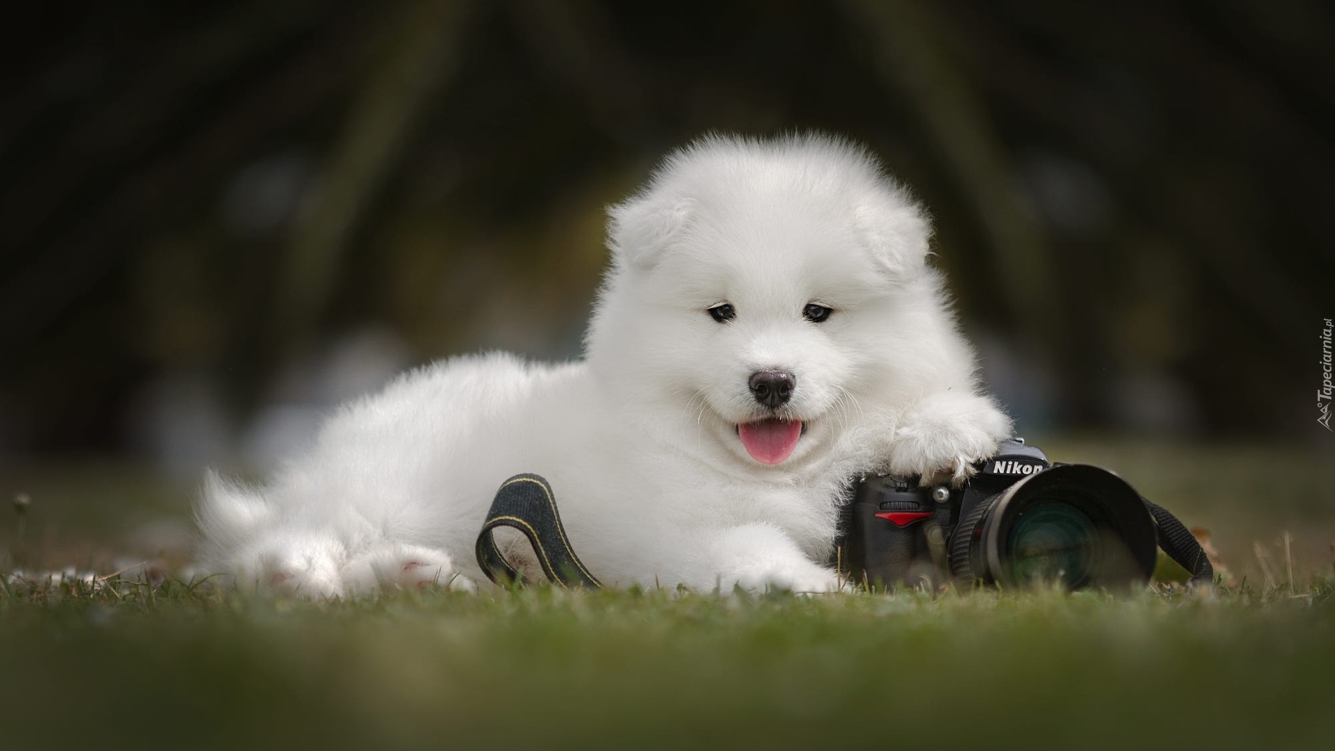 Edytor tapety: Szczeniak samojed obok aparatu fotograficznego