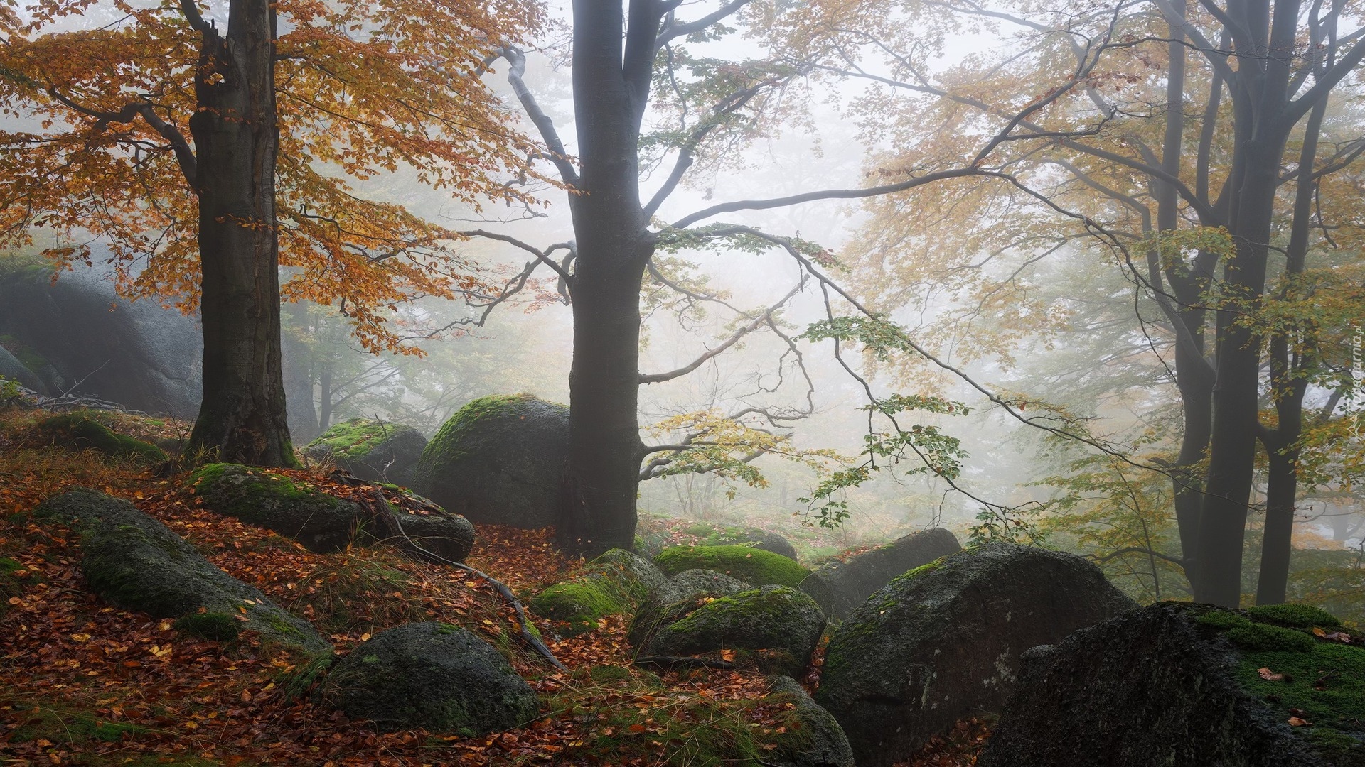 Edytor tapety: Głazy pod jesiennymi drzewami w zamglonym lesie