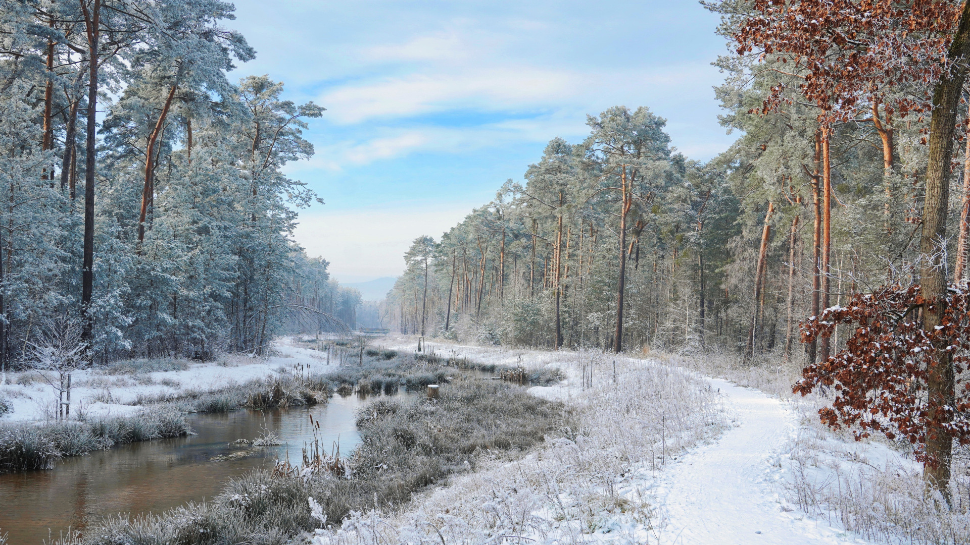 Edytor tapety: Oszroniona trawa i drzewa nad leśną rzeczką
