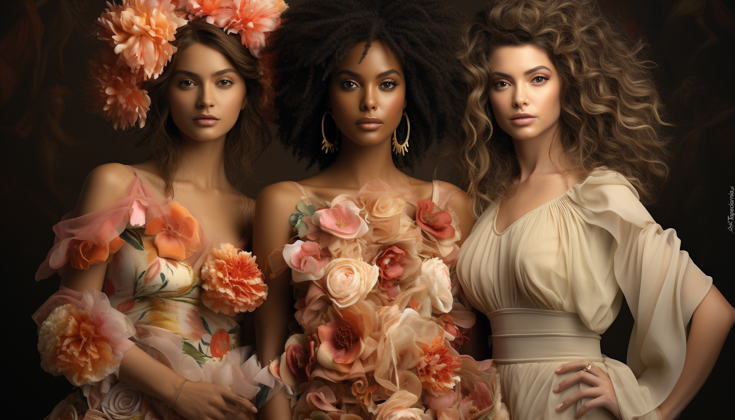 Edytor tapety: Trzy kobiety i kwiaty na ciemnym tle