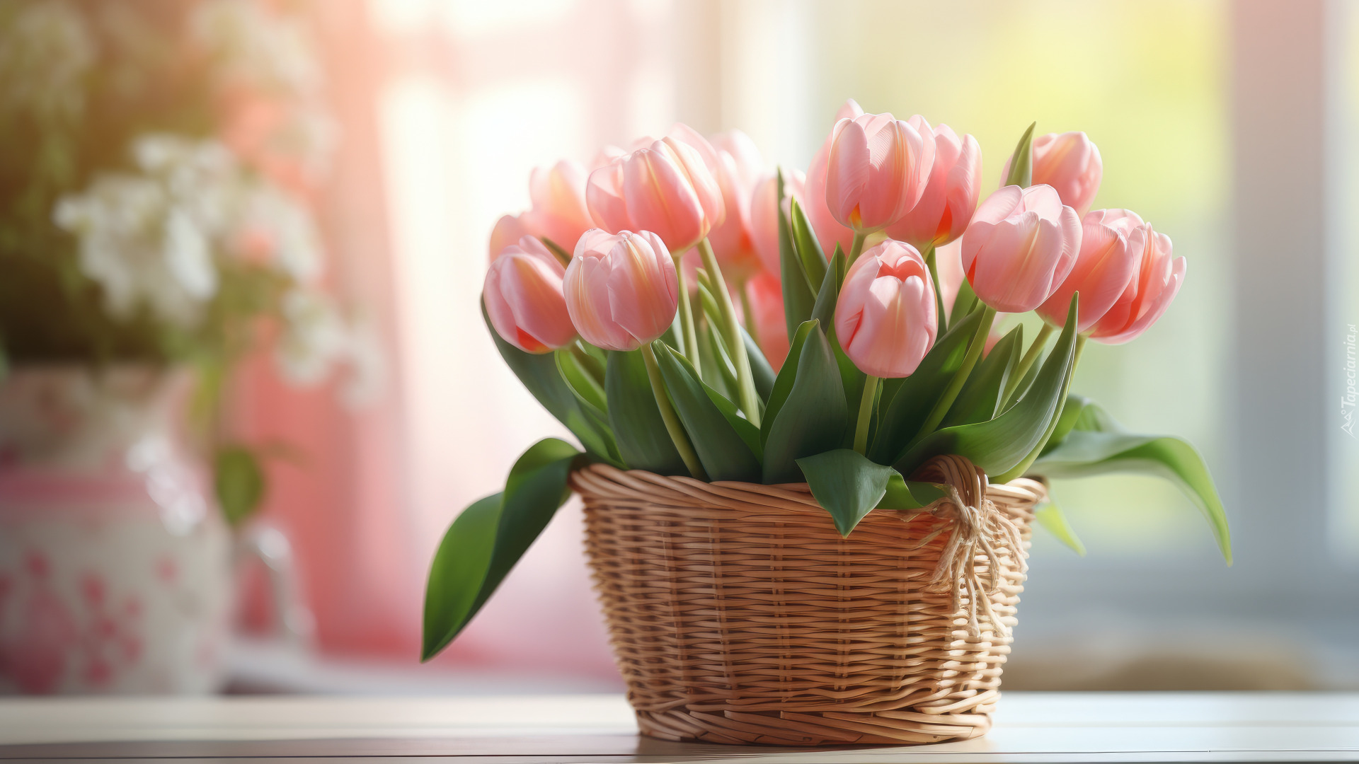 Edytor tapety: Bukiet różowych tulipanów w wiklinowym koszu