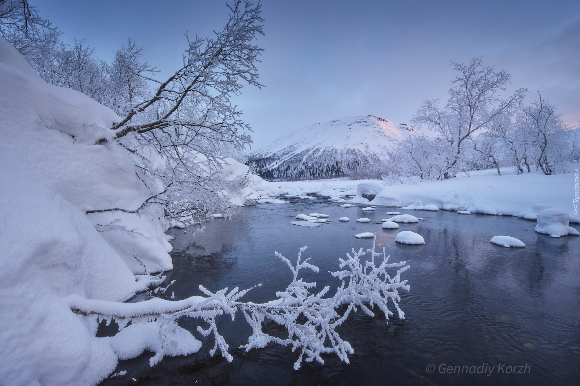 Edytor tapety: Ośnieżone drzewa nad rzeką i góra w oddali