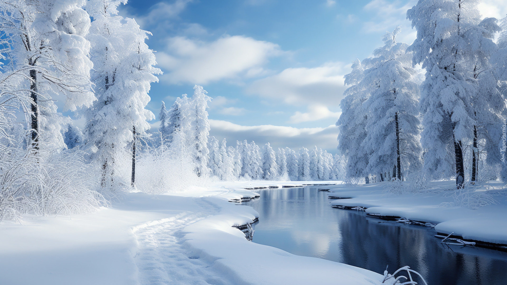 Edytor tapety: Ośnieżone drzewa nad brzegiem rzeki zimą