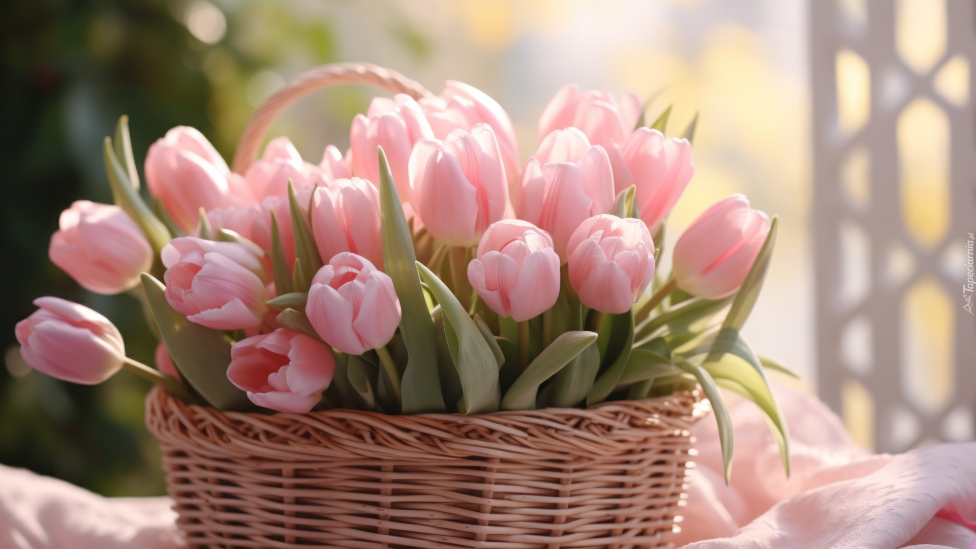 Edytor tapety: Wiklinowy koszyk z różowymi tulipanami