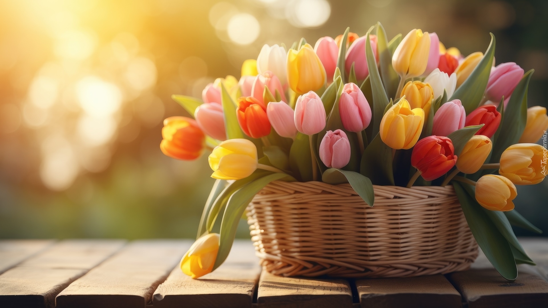 Edytor tapety: Kolorowe tulipany w koszu na deskach