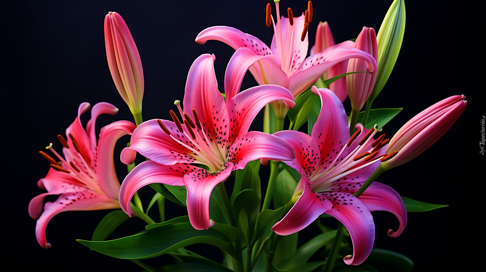 Edytor tapety: Rozświetlone różowe lilie na czarnym tle