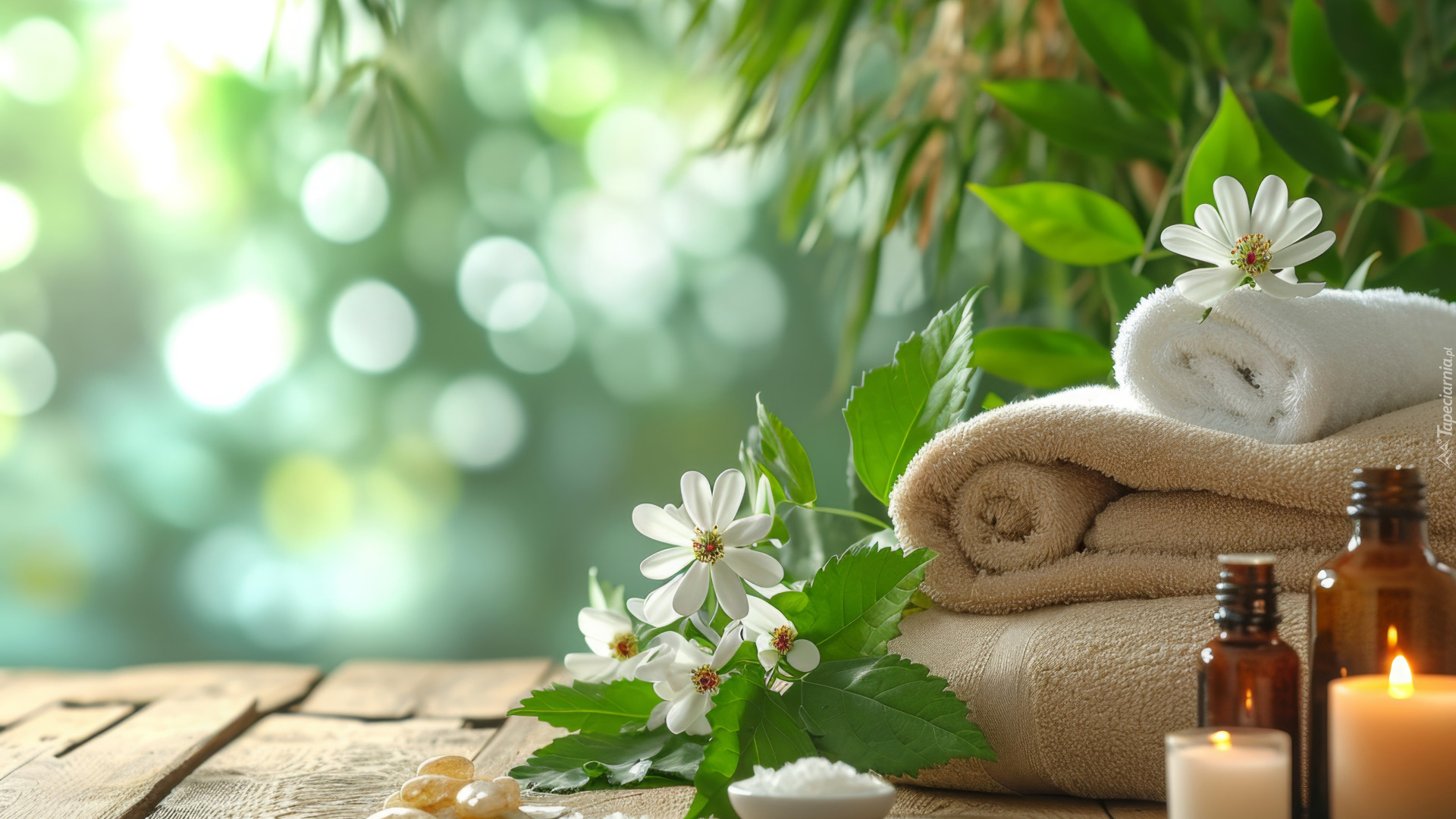 Edytor tapety: Świece i butelki obok ręczników i białych kwiatków